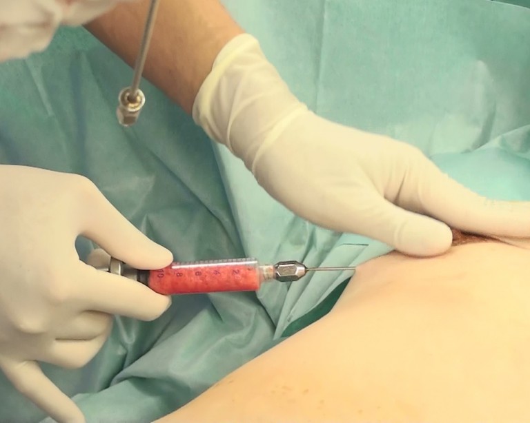腹部よりパチンコ玉大の脂肪組織を採取すれば、約3週間で1×108個の脂肪幹細胞を培養できます。脂肪の再構築に必要不可欠であるこの脂肪幹細胞と足場となる脂肪細胞を混ぜて、同時に移植すれば生着率が格段に上昇します。